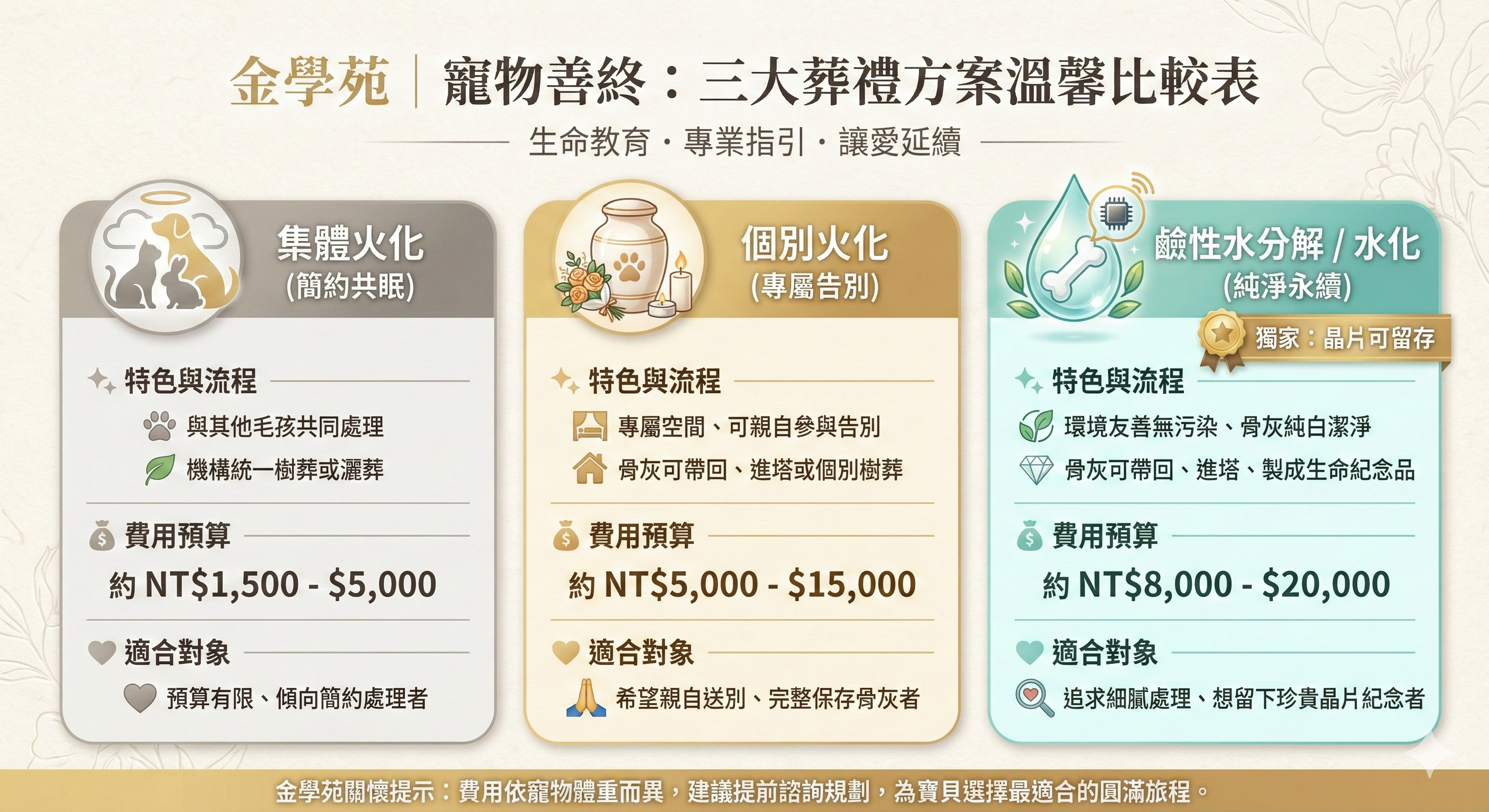 目前台灣寵物殯葬主要分為「集體火化」與「個別火化」,近年來更有環境友善的「水化」與「樹葬」等多樣選擇。