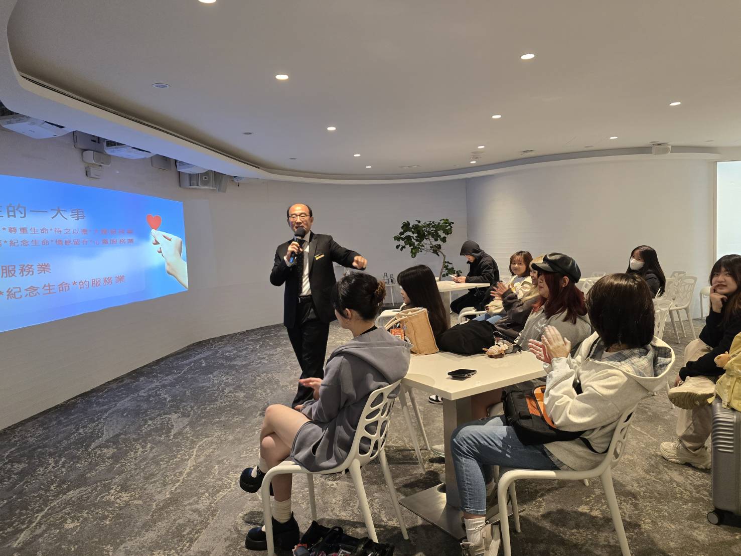 金寶山秉持「以家屬為中心」的服務設計,從接待、禮儀規劃、告別式安排到後續關懷,都以專業團隊執行。協理分享的實際案例,也讓學生明白生命關懷服務並非只有流程,更包含情緒支持、倫理思考與跨領域協作。