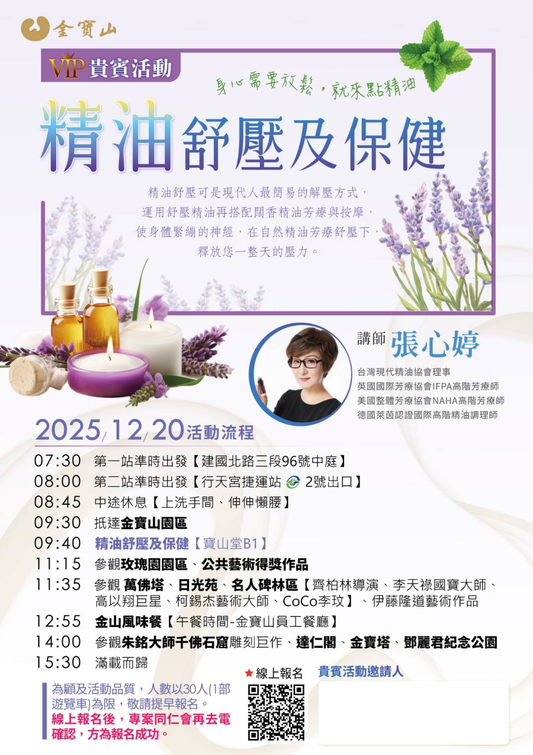 在金寶山「寶山堂」的靜謐空間中,我們將透過精油舒壓與專業按摩技法,解開緊繃的神經結。從植物的香氣中,學習如何以最溫柔的方式,撫平現代生活的焦慮與躁動,讓身心重回平衡的基準點。
