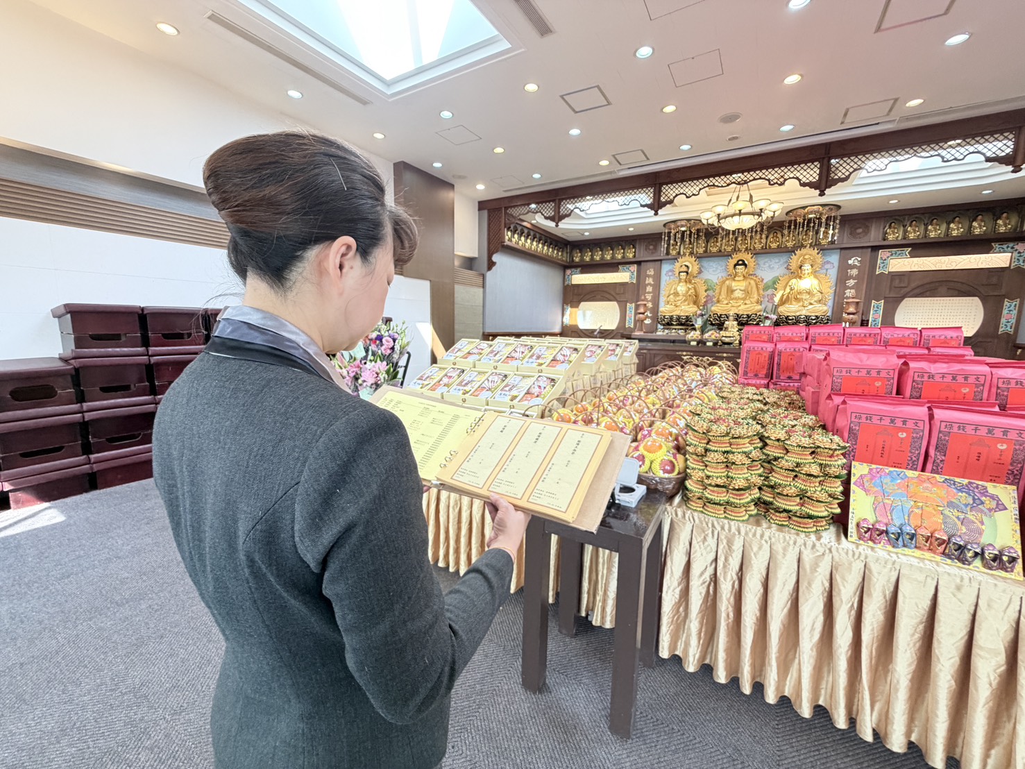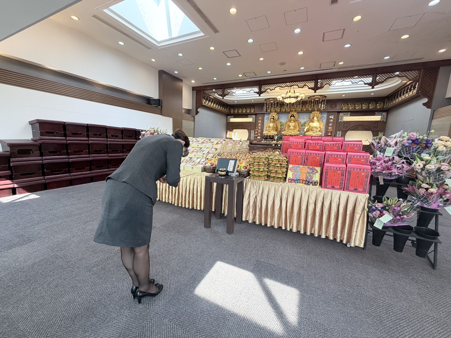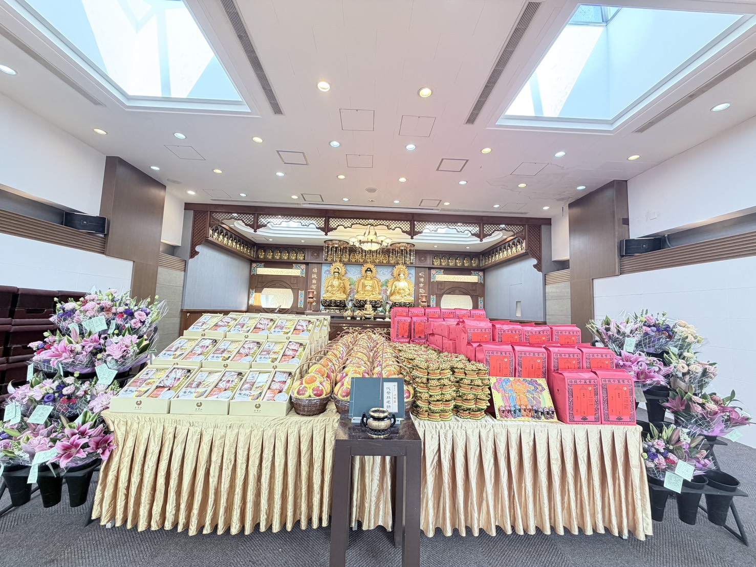 專屬供品敬獻: 依照傳統禮俗與家屬委託,精心準備鮮花、素果與豐盛祭品,誠心供奉,傳達家屬的最高敬意。